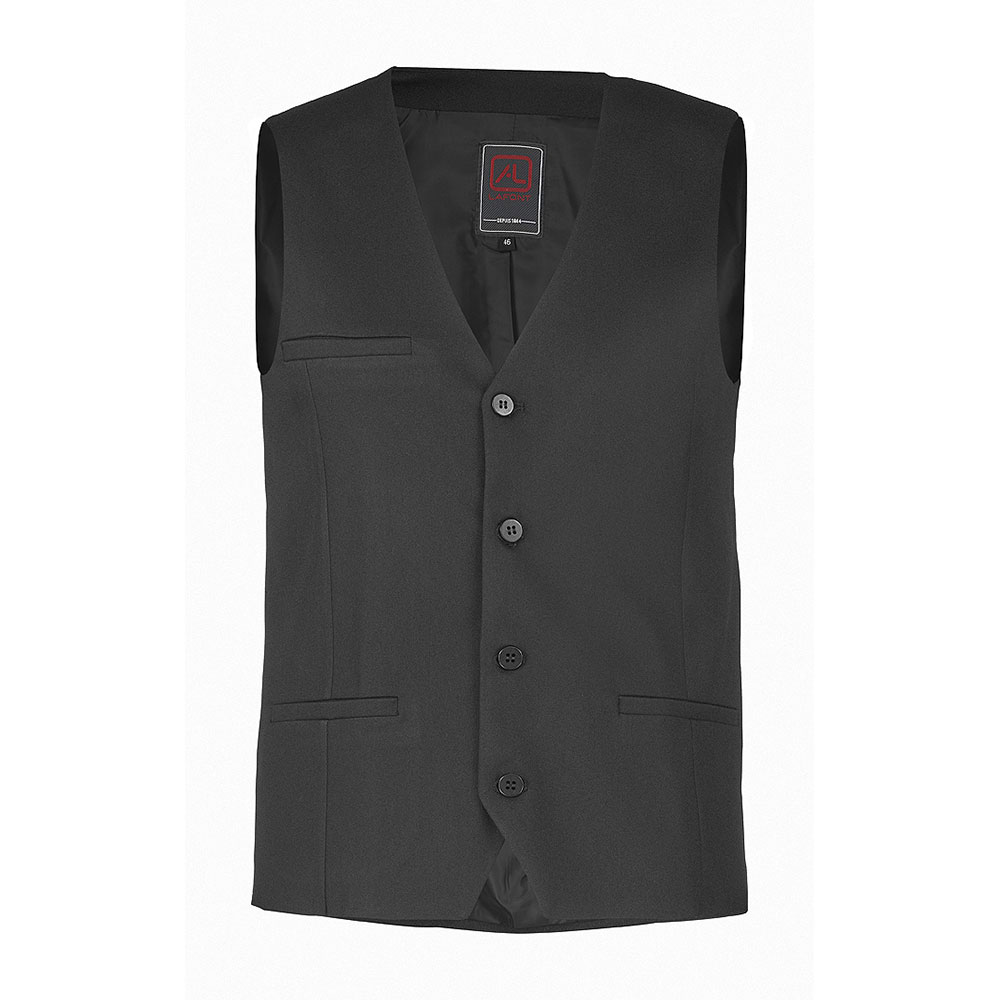 Das klassische Design wird durch eine Knopfleiste, zwei Paspeltaschen sowie eine Brusttasche auf der rechten Seite unterstrichen. Erhältlich in Schwarz, Marineblau und Anthrazitgrau, lässt sich die ärmellose Weste ideal mit einem weißen Hemd und einer Anzugshose kombinieren – für einen souveränen und gepflegten Auftritt im Restaurant oder Hotel.