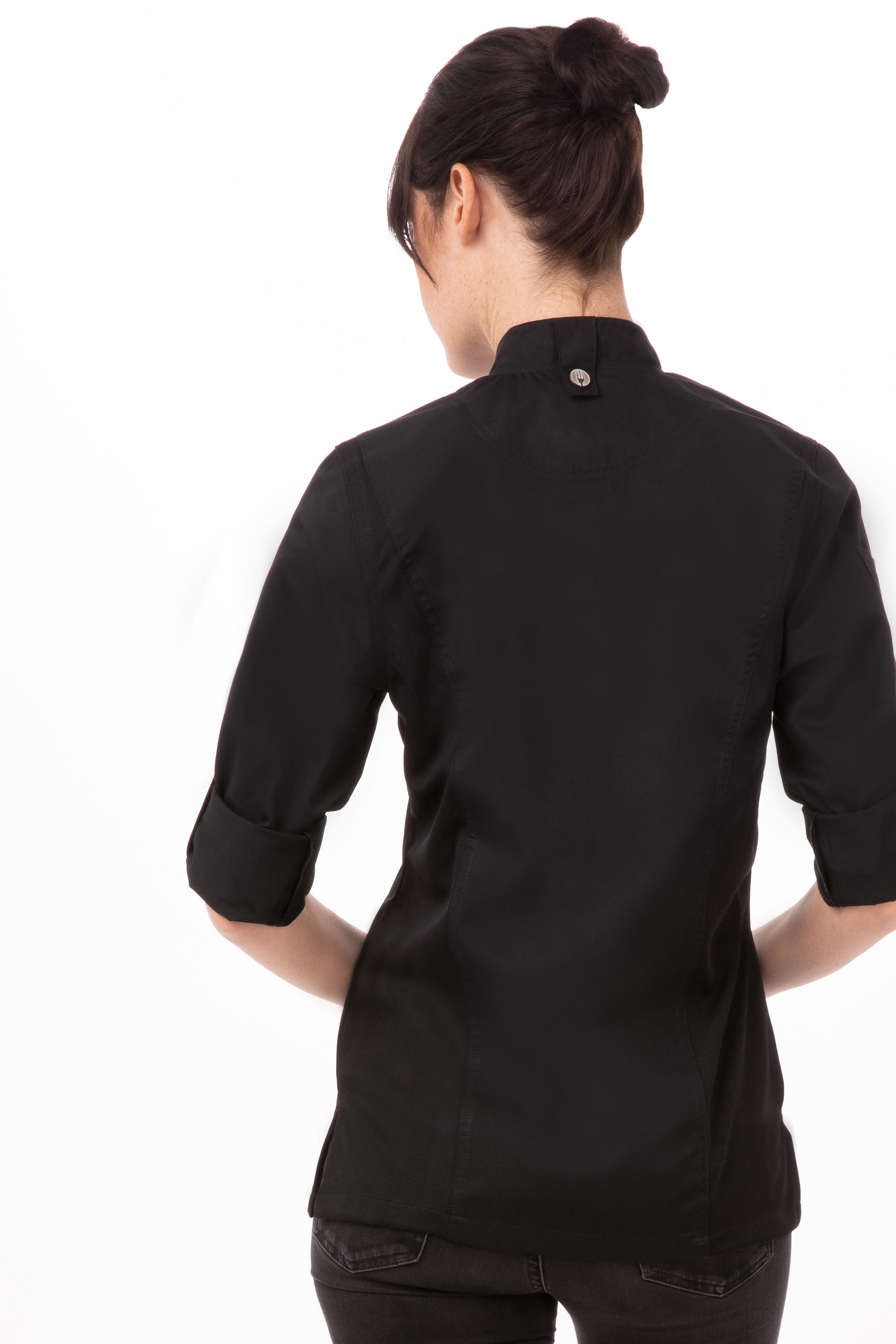 Kochjacke aus einem "lite" Twill-Stoff mit Cool Vent™-Einsätzen bis hoch zu den Schultern, mit Seitennahtschlitze für mehr Flexibilität, einreihigem Design und verstecktem Reißverschluss, Roll-Up Ärmeln, einer Latzschürzenschlaufe im Nacken, einer zweigeteilten Oberarmtasche links und einer großen Oberarmtasche rechts.