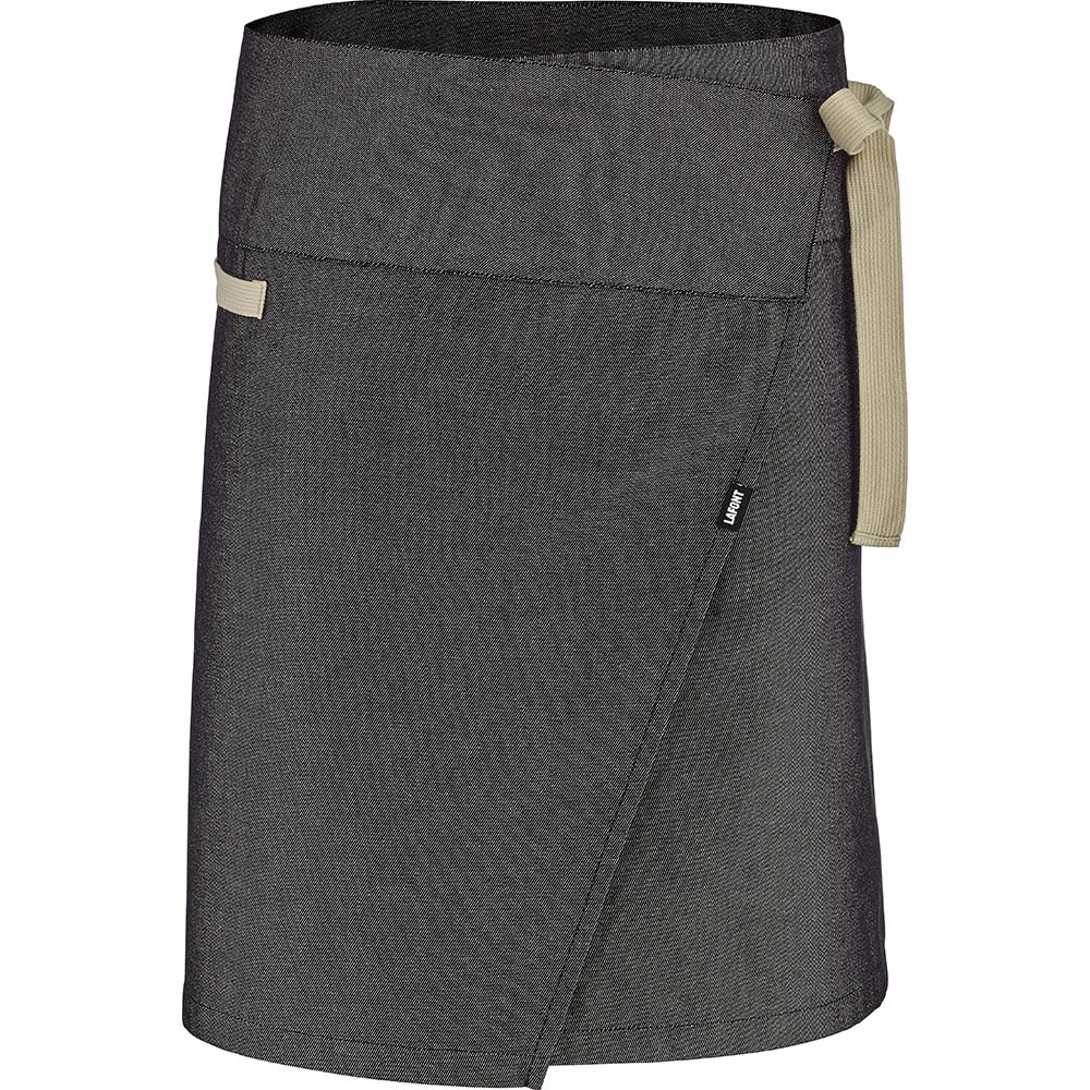 Kurze Jeansschürze. Beiger Gürtel mit Flechtband. Zwei aufgesetzte Taschen unten mit abgeschrägten Ecken. Direkte Stickerei „LAFONT blau/weiß/rot” auf der rechten Tasche. Länge: 52 cm – Breite: 100 cm.Diese Serviceschürze aus Jeansstoff hat einen modernen Stil, bei dem ihr beiger Bund einen tollen Kontrast zum Jeansblau bildet. Die weiche, kurze Küchenschürze Arras ist leicht und besteht aus 47 % Baumwolle, 39 % Viskose, 12,5 % Polyester und 1,5 % Elasthan. Sie hat zudem zwei Taschen, in denen Kellner und Barkeeper Notizbuch, Stift und Flaschenöffner griffbereit aufbewahren können. Diese Unisex-Schürze ohne Latz ist als Einheitsgröße erhältlich. Ihre Maße sind 52 x 100 cm und dank der verschiebbaren Bänder aus geflochtenem Material passt sie sich der individuellen Körperform des Trägers an.