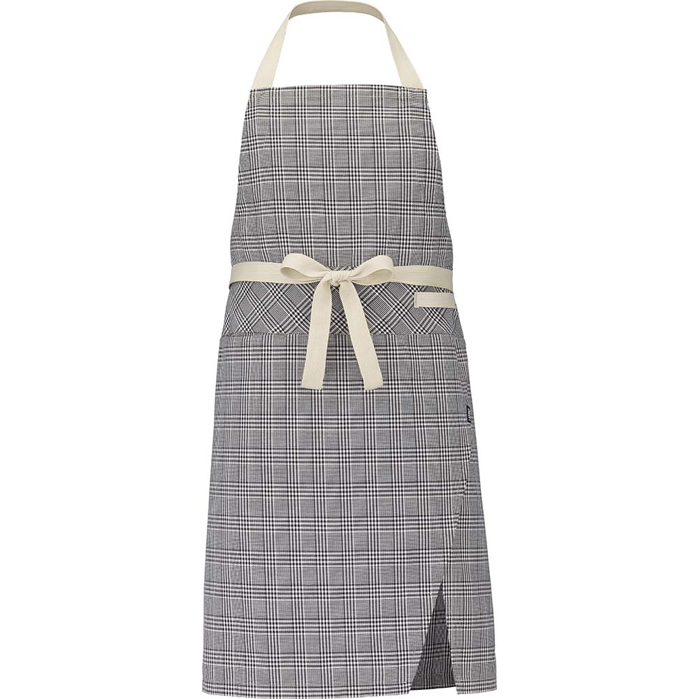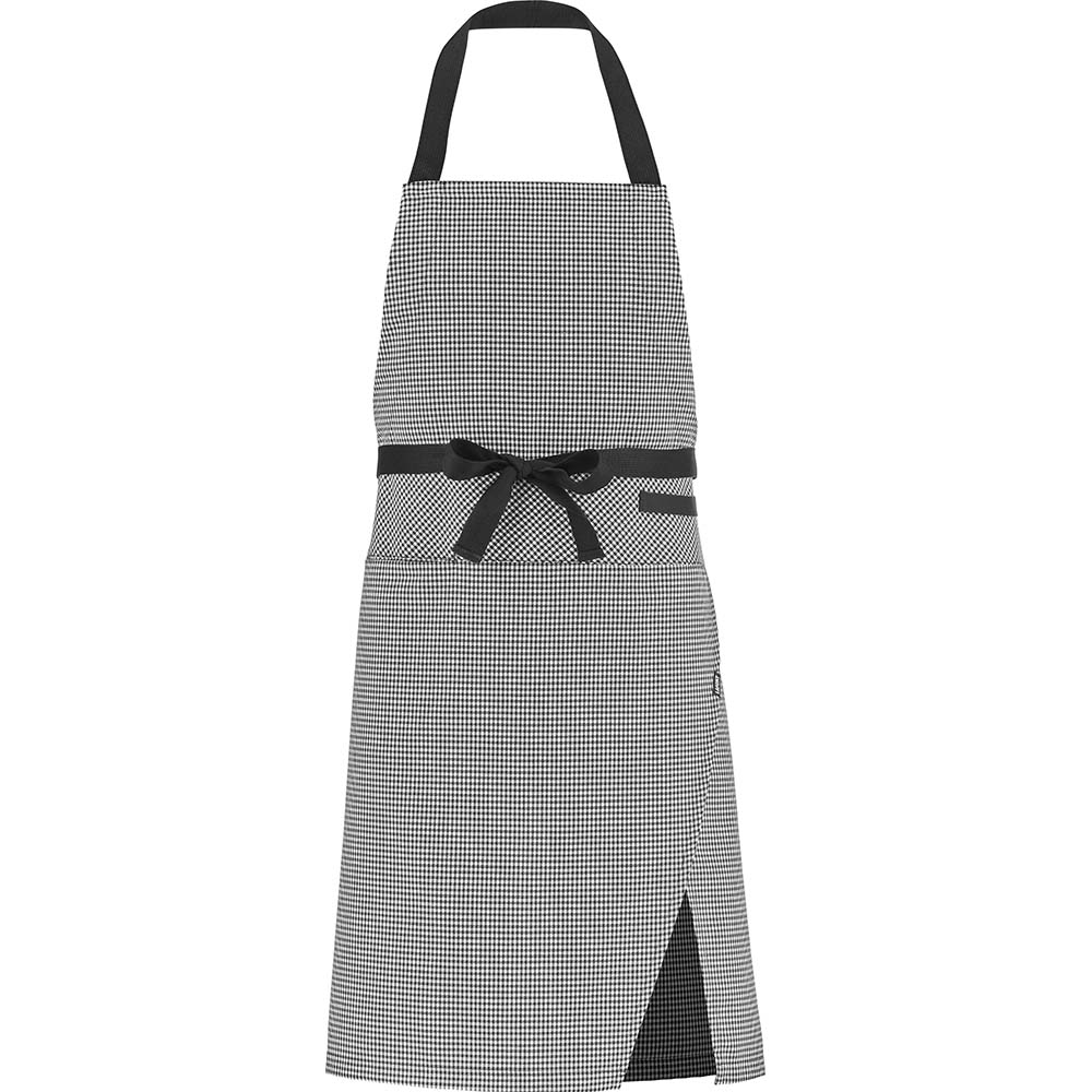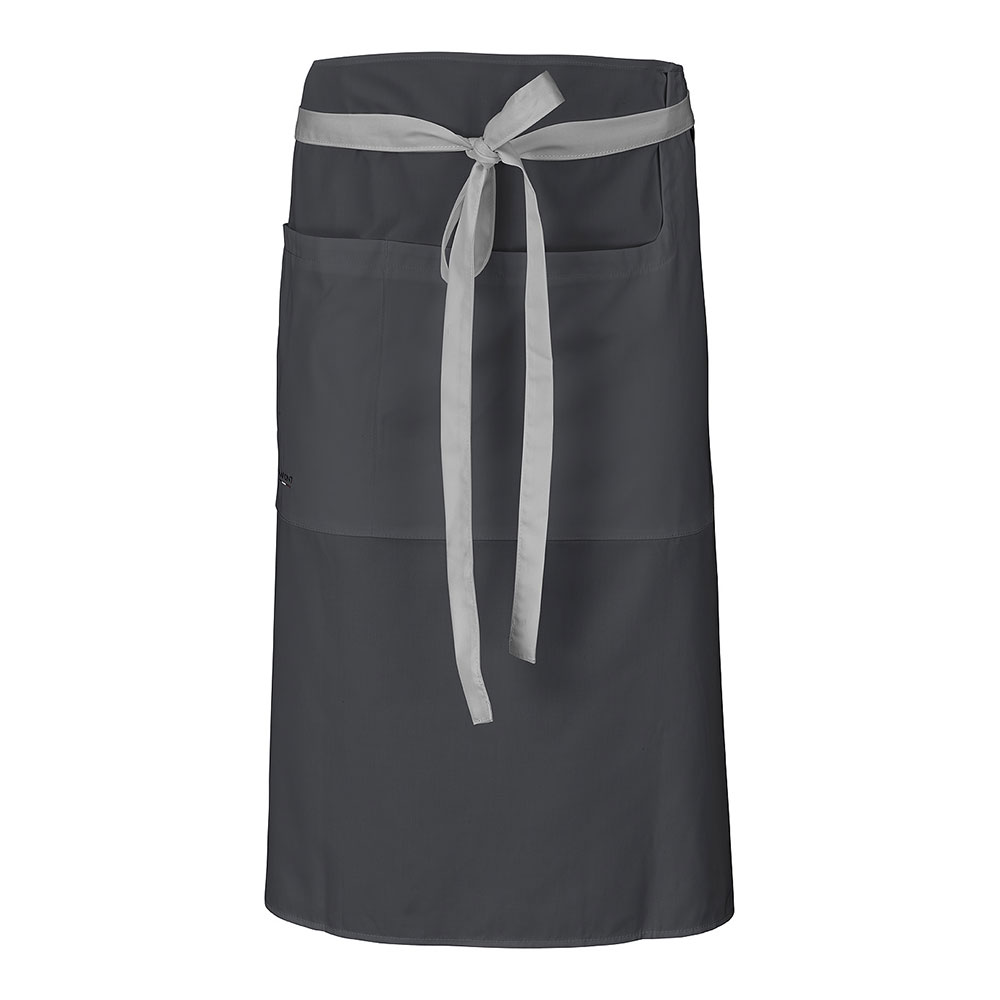 Verstellbarer Halsausschnitt | Tasche mit Aussparung | Kontrastband | Halterung für Geschirrtuch | Geh-Schlitz auf Kniehöhe | Höhe 90 cmSchürze mit Doppelfunktion, konzipiert für alle Beschäftigten in Küche und Restaurant. Sie ist mit einem verstellbaren Halsumfang, einer praktischen Tasche vorne sowie einer integrierten Geschirrtuchhalterung ausgestattet und verfügt auf Kniehöhe über einen Schlitz, der die Bewegungsfreiheit verbessert. Diese umweltschonend gestaltete Schürze kann mit heruntergeklapptem Latz auch als Hüftschürze getragen werden – eine Vielseitigkeit, die sich ganz Ihrem Bedarf anpasst.Hahnentritt 240 GR/M² - Graphitgrau 260 GR/M² - Schwarz / Beige 300 GR/M²