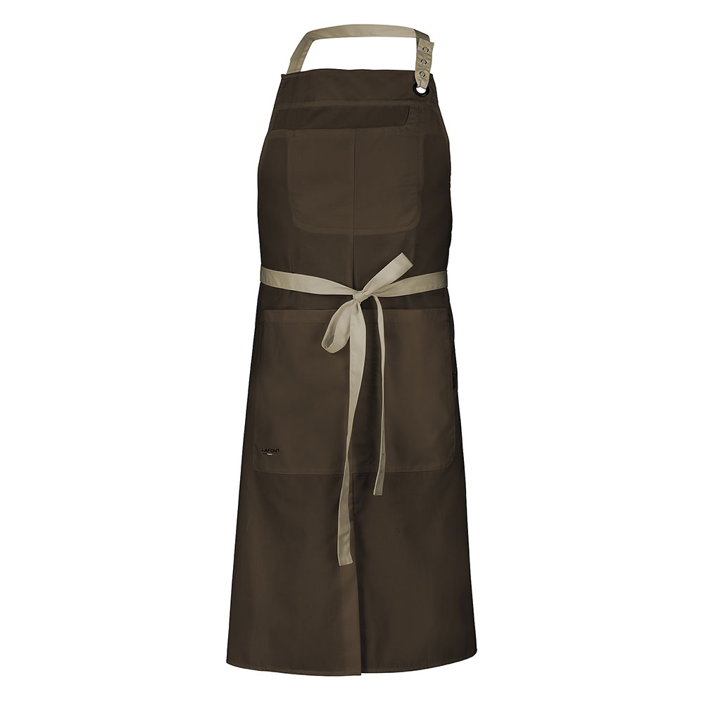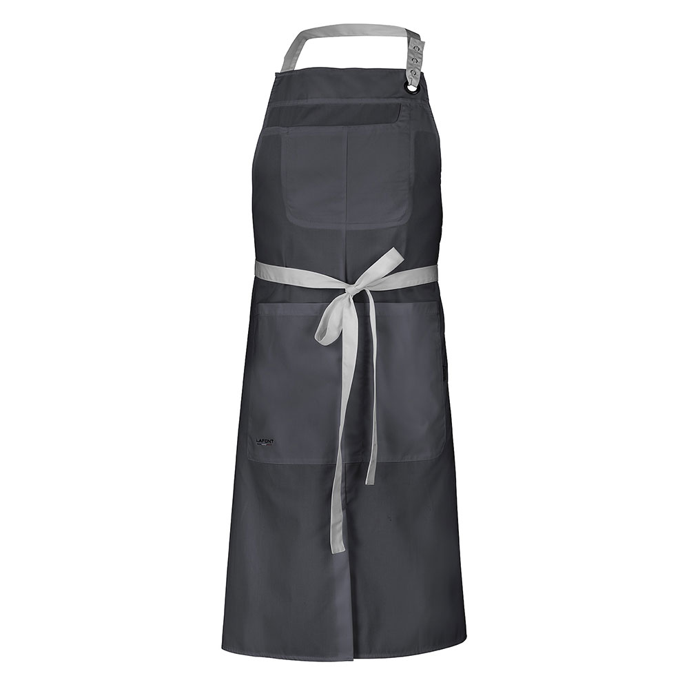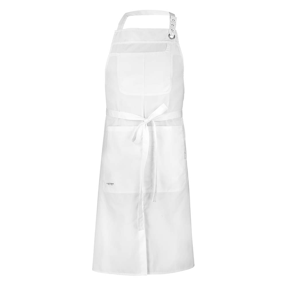 Latzschürze | Verstellbares Nackenband | Eine Latztasche und eine große Tasche mit zwei Fächern | Direkte Stickerei „LAFONT blau/weiß/rot“ unten links an der rechten Tasche | Länge: 100 cm – Breite: 95 cmEine moderne und praktische Latzschürze für alle Berufstätigen in der Gastronomie. Die pflegeleichte Küchenschürze Clove ist auch strapazierfähig. Sie besteht aus 50 % Baumwolle und 50 % Polyester, das bei 60° C gewaschen werden kann. Sie hat ein Band zur Weitenregulierung mit Druckknöpfen rund um den Hals, eine Tasche auf dem Latz und eine sehr funktionelle große Bauchtasche mit Doppelfach. Diese professionelle Kochschürze wird durch einen Taillenbund gehalten, der sich leicht an jede Körperform anpassen lässt. Diese Kochschürze ist in Weiß oder Schwarz oder drei weiteren zweifarbigen Ausführungen erhältlich. Verleihen Sie Ihrem Küchenoutfit einen eleganten Farbtupfer. Höhe 100cm.